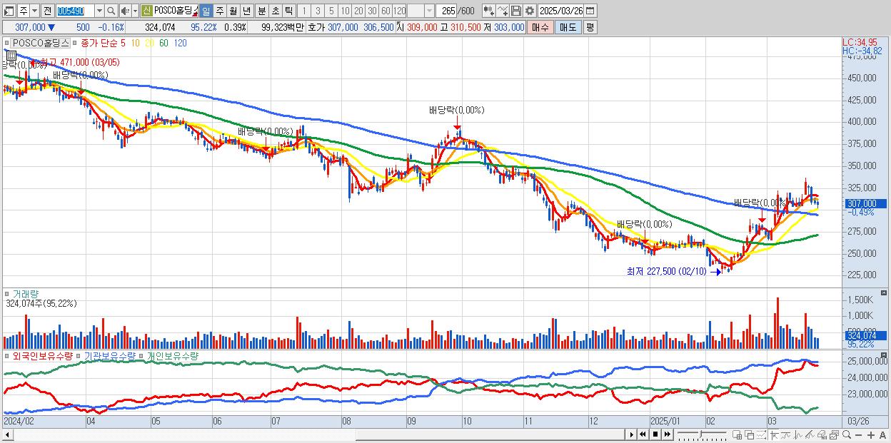 - POSCO홀딩스 (307,000원 ▼ -0.16% , 시총: 253,657억, 거래량: 254,049, 거래대금:779억)