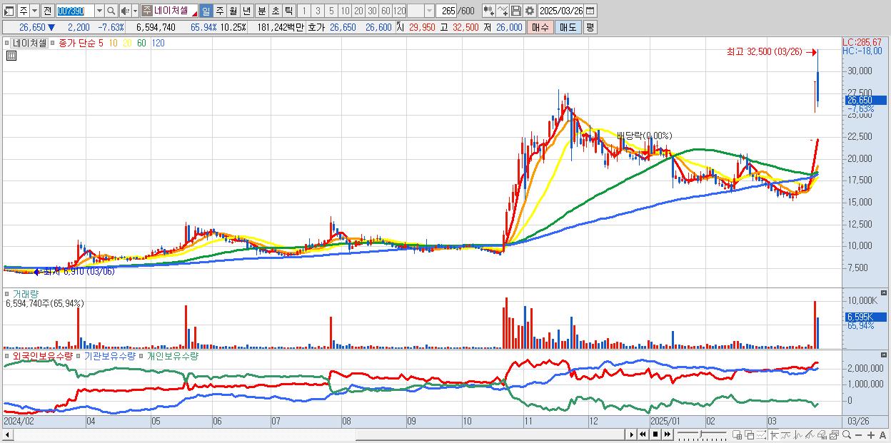 - 네이처셀 (26,650원 ▼ -7.63% , 시총: 17,151억, 거래량: 3,629,166, 거래대금:986억)