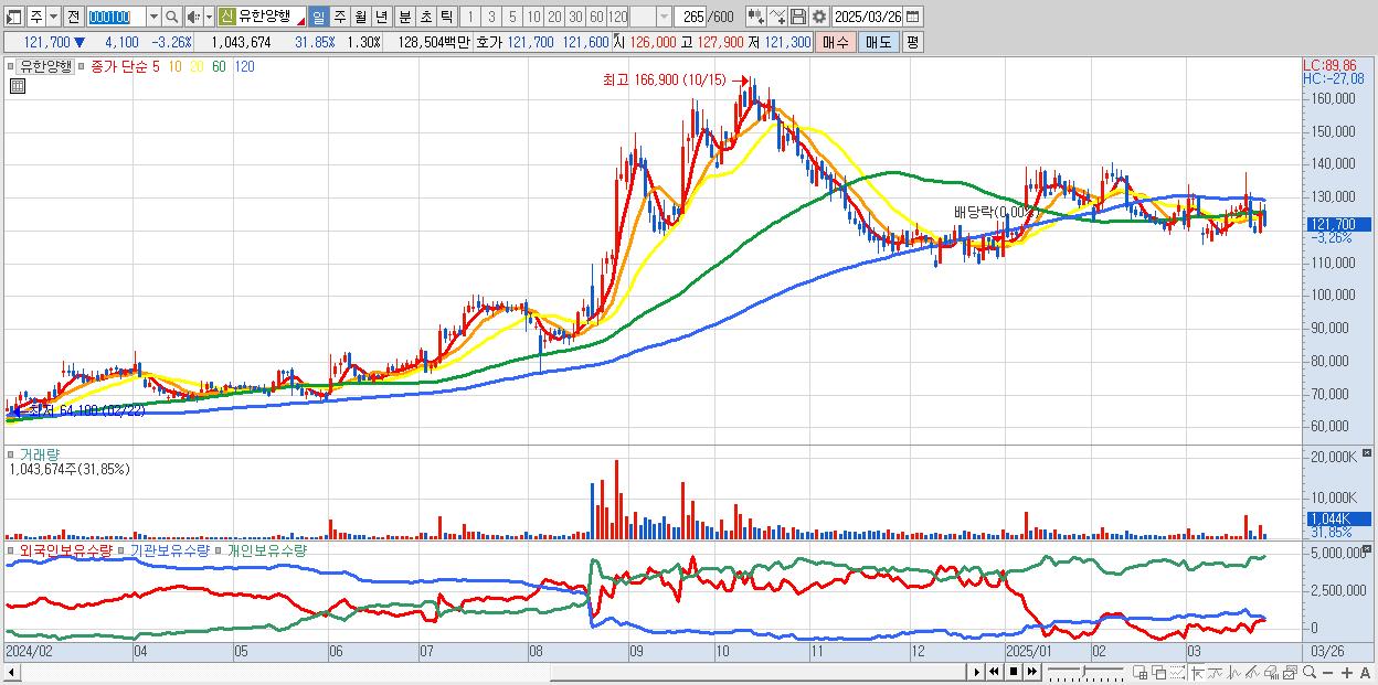 - 유한양행 (121,600원 ▼ -3.34% , 시총: 97,534억, 거래량: 674,565, 거래대금:829억)