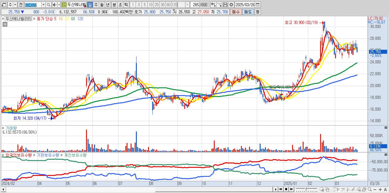 - 두산에너빌리티 (25,750원 ▼ -3.01% , 시총: 164,944억, 거래량: 4,072,877, 거래대금:1,066억)