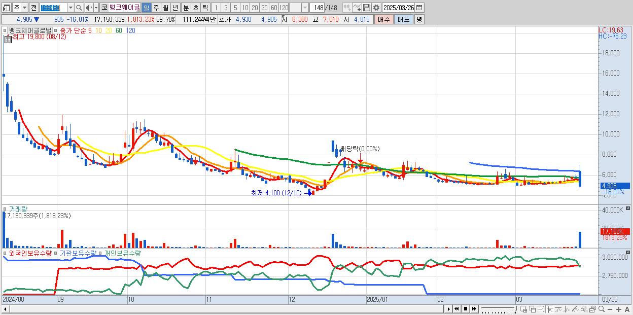 - 뱅크웨어글로벌 (4,905원 ▼ -16.01% , 시총: 495억, 거래량: 17,150,339, 거래대금:1,112억)