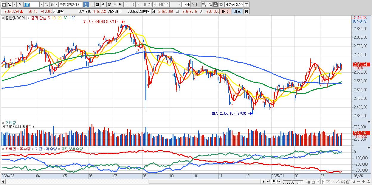 | 03/26 | 2,643.94 | ▲1.08% | -6,798억 | 3,504억 | 2,603억 | 691억 |