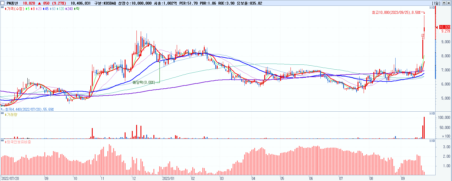 PN풍년 10,020원 ▲ 9.27% (KOSDAQ, 024940)
