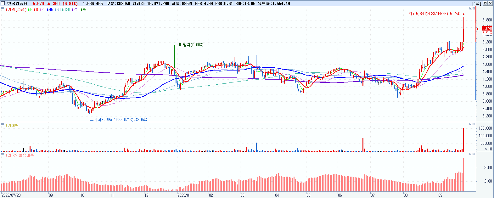 - 한국컴퓨터 (5,570원 ▲ 6.91% , 시총: 895억, 거래량: 1,536,465, 거래대금:87억, KOSDAQ)
