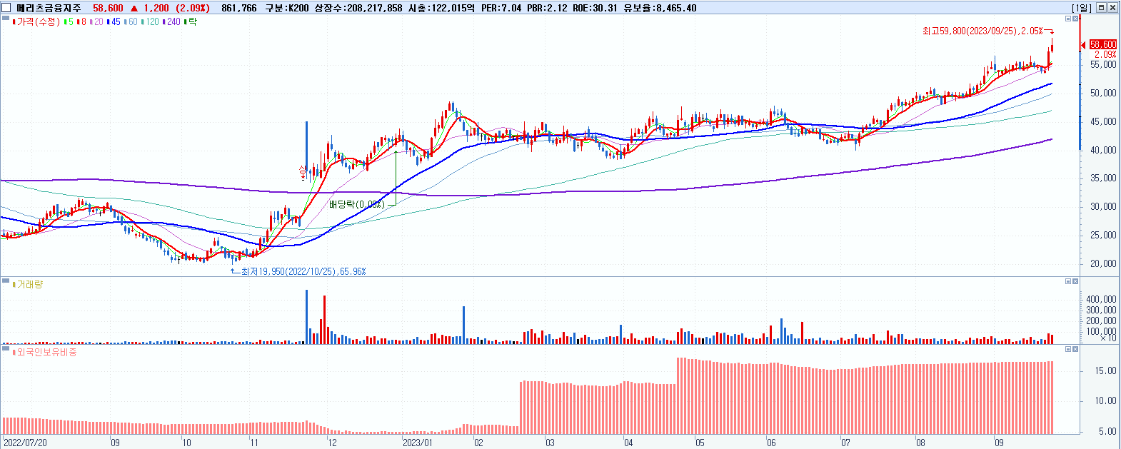- 메리츠금융지주 (58,600원 ▲ 2.09% , 시총: 122,016억, 거래량: 860,116, 거래대금:503억, KOSPI)