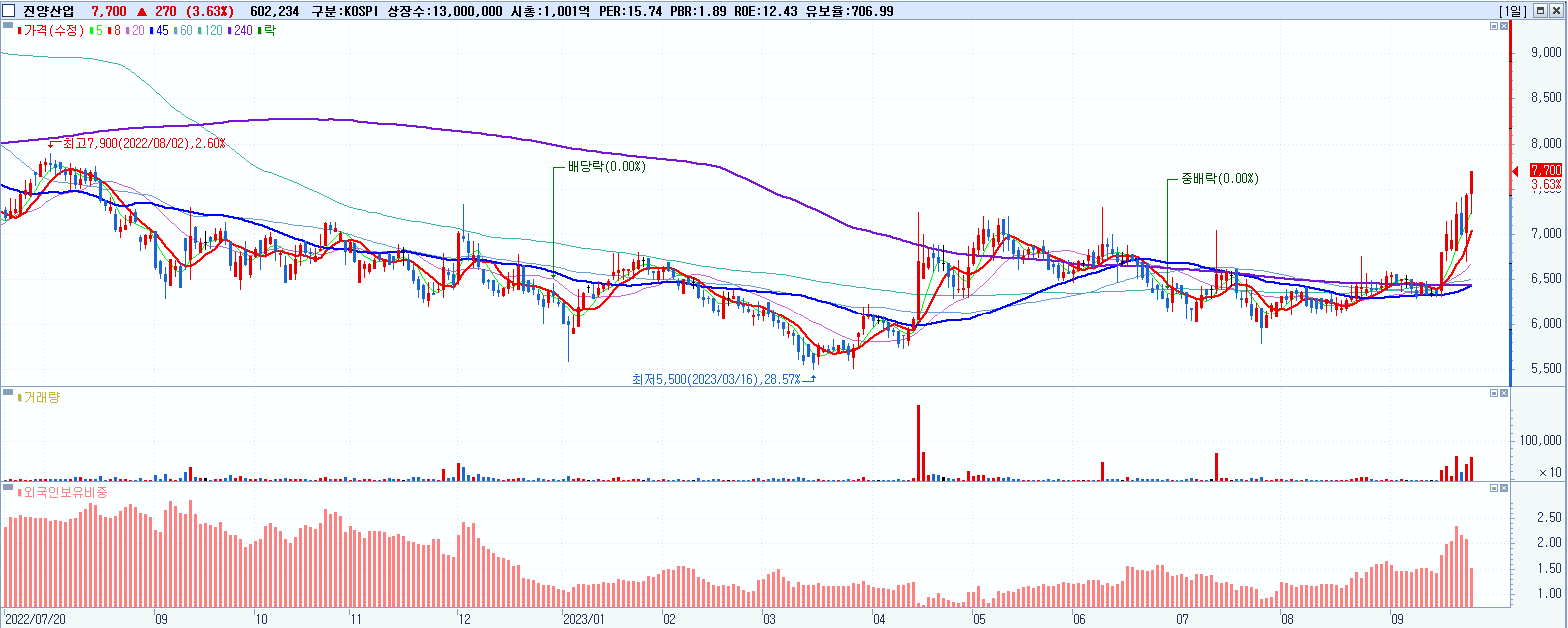 진양산업 7,700원 ▲ 3.63% (KOSPI, 003780)
