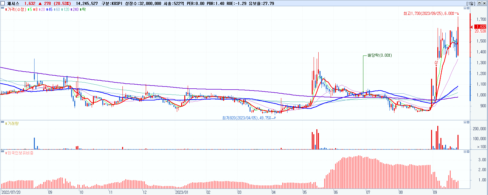 - 체시스 (1,632원 ▲ 20.53% , 시총: 522억, 거래량: 14,067,901, 거래대금:229억, KOSPI)