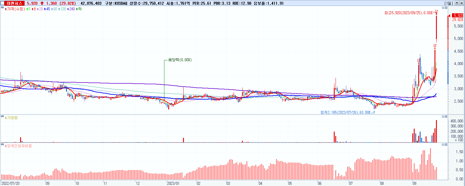 - 이랜시스 (5,920원 ▲ 29.82% , 시총: 1,761억, 거래량: 42,076,403, 거래대금:2,264억, KOSDAQ)
