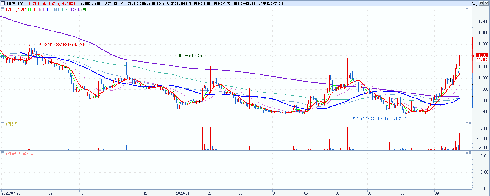 - 아센디오 (1,201원 ▲ 14.49% , 시총: 1,042억, 거래량: 7,856,643, 거래대금:94억, KOSPI)