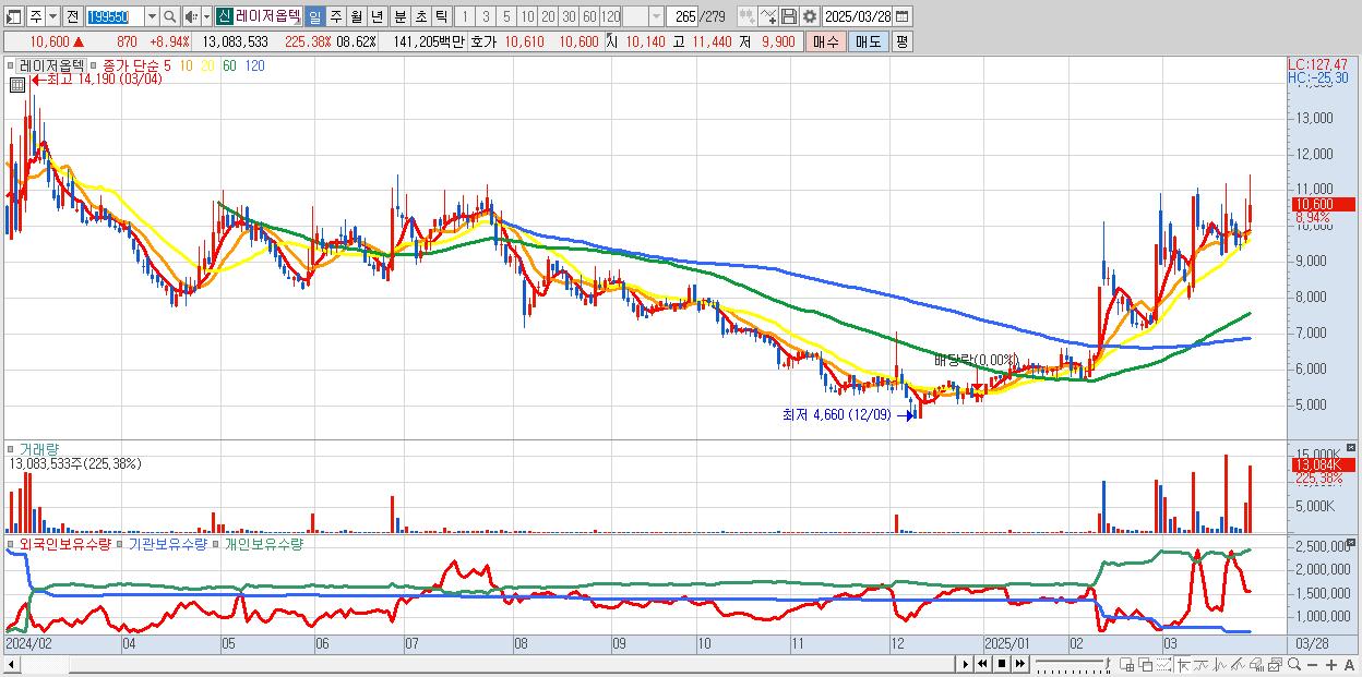 - 레이저옵텍 (10,600원 ▲ 8.94% , 시총: 1,277억, 거래량: 13,083,533, 거래대금:1,412억)