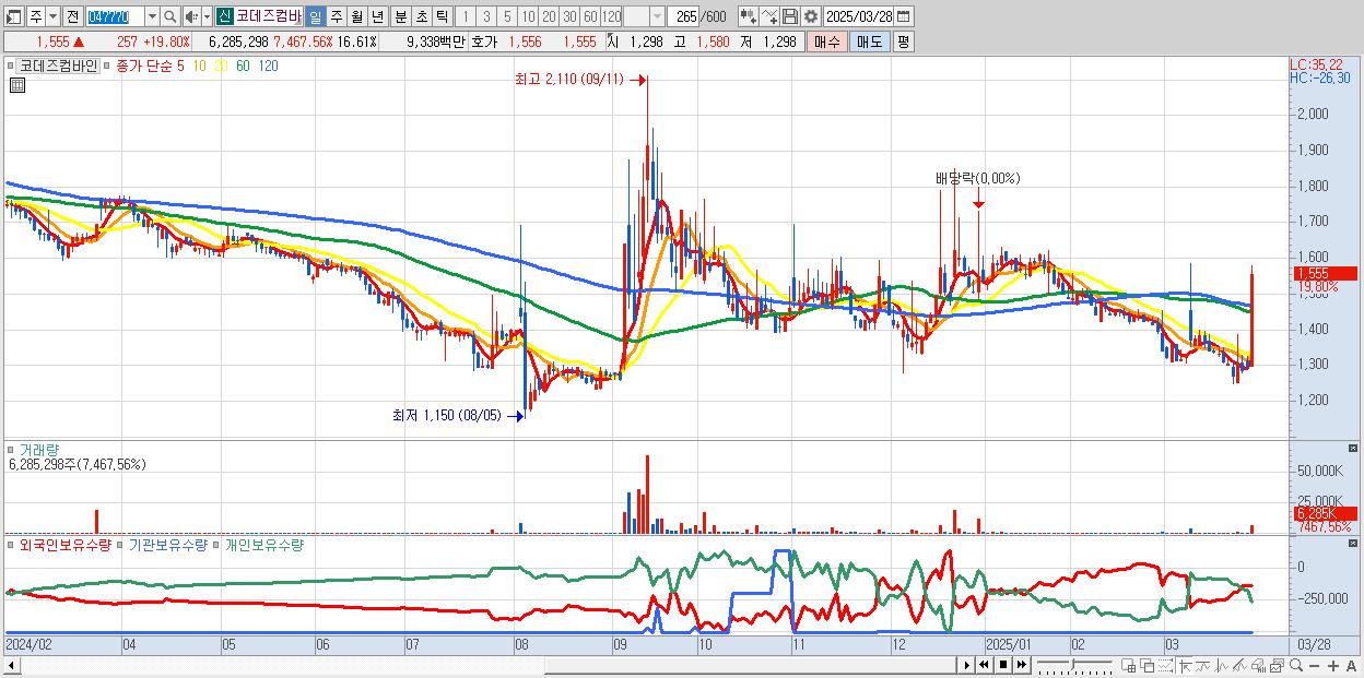 - 코데즈컴바인 (1,555원 ▲ 19.8% , 시총: 588억, 거래량: 6,285,298, 거래대금:93억)