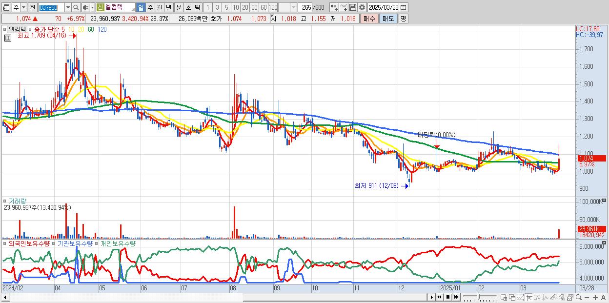 - 엘컴텍 (1,074원 ▲ 6.97% , 시총: 907억, 거래량: 23,960,937, 거래대금:261억)