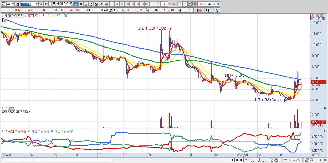 - 바이오인프라 (6,630원 ▲ 6.94% , 시총: 323억, 거래량: 885,383, 거래대금:60억)