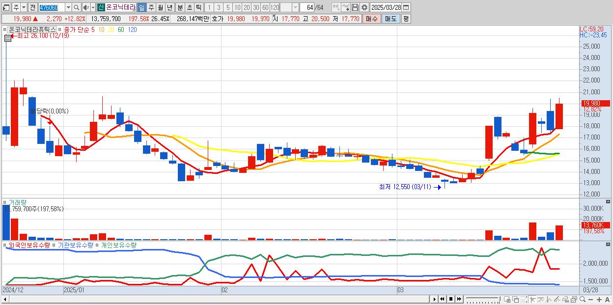 - 온코닉테라퓨틱스 (19,980원 ▲ 12.82% , 시총: 2,174억, 거래량: 13,759,700, 거래대금:2,681억)