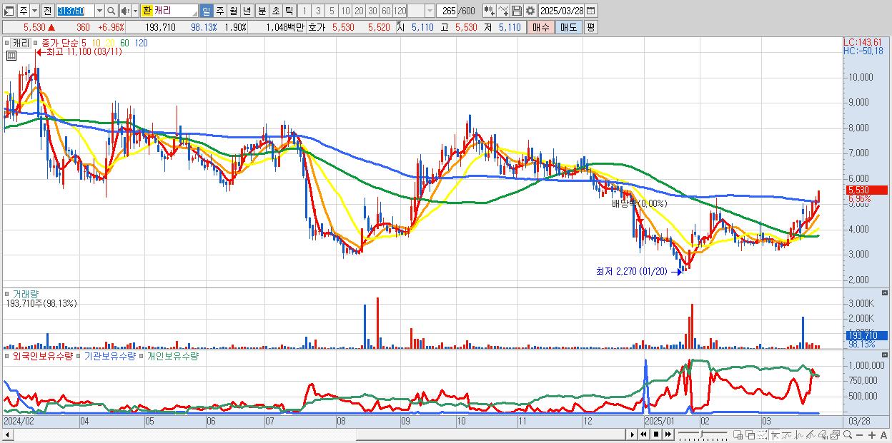 - 캐리 (5,530원 ▲ 6.96% , 시총: 563억, 거래량: 193,710, 거래대금:10억)