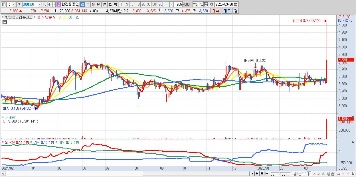 - 한진중공업홀딩스 (3,830원 ▲ 7.58% , 시총: 1,131억, 거래량: 1,179,900, 거래대금:47억)