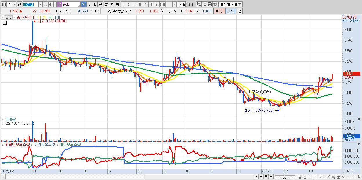 - 율호 (1,952원 ▲ 6.96% , 시총: 1,371억, 거래량: 1,522,488, 거래대금:29억)