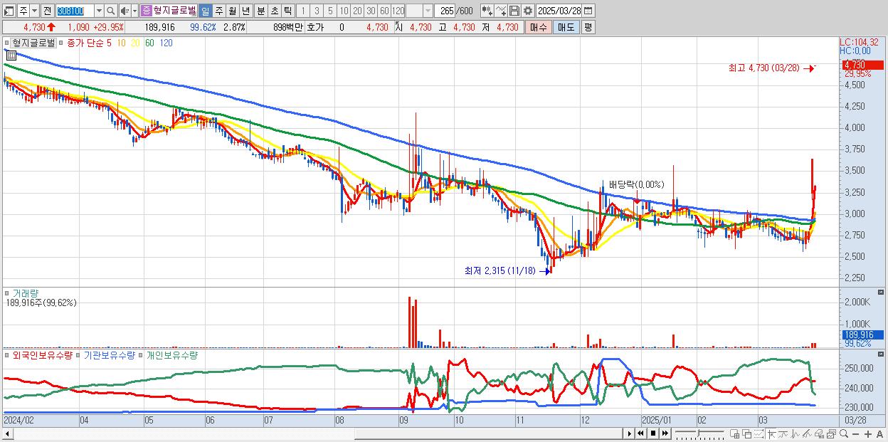 - 형지글로벌 (4,730원 ▲ 29.95% , 시총: 313억, 거래량: 189,916, 거래대금:9억)