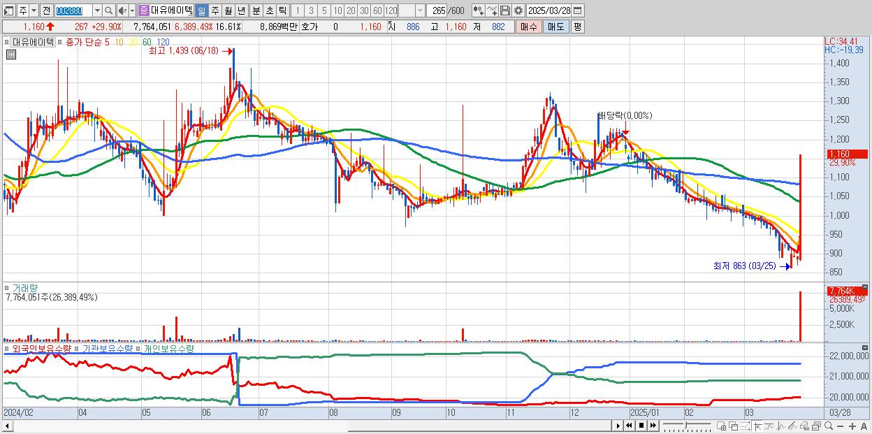 - 대유에이텍 (1,160원 ▲ 29.9% , 시총: 542억, 거래량: 7,764,051, 거래대금:89억)