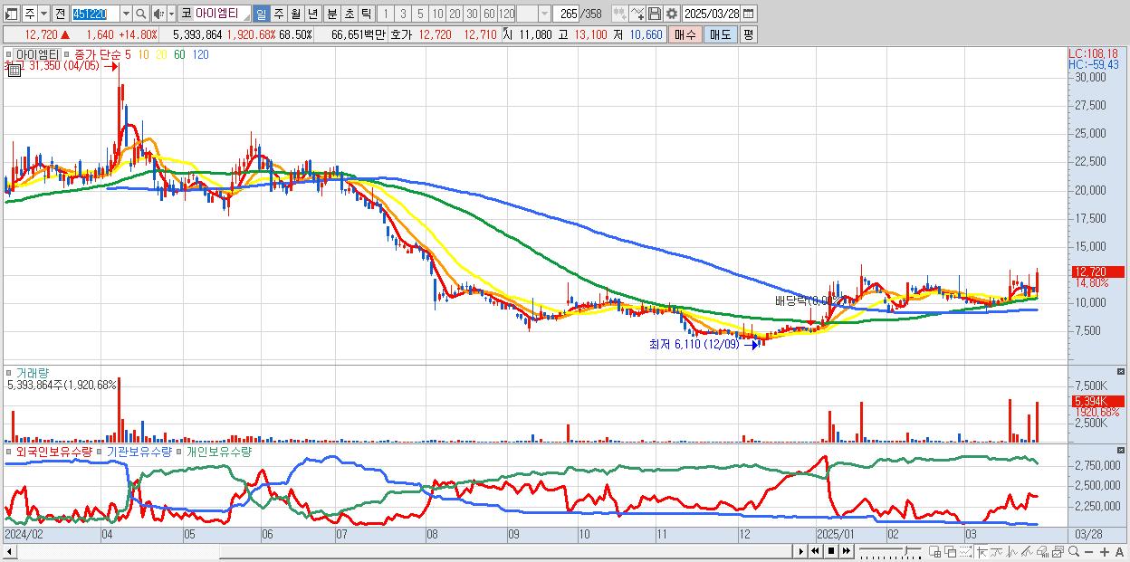 - 아이엠티 (12,720원 ▲ 14.8% , 시총: 1,002억, 거래량: 5,393,864, 거래대금:667억)