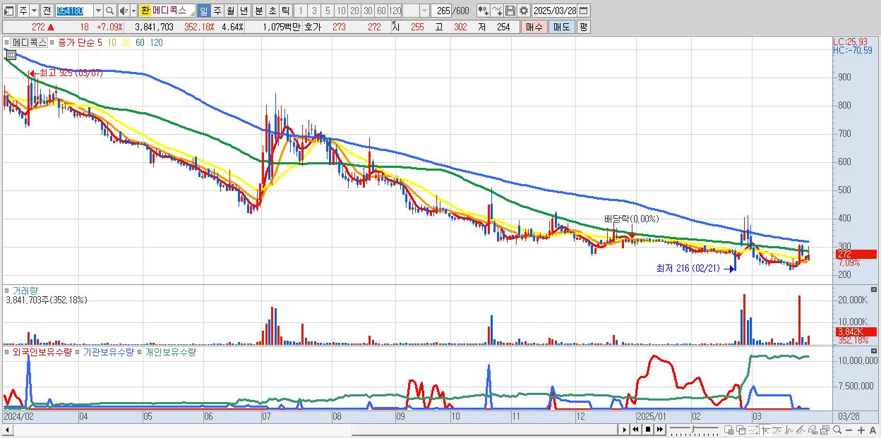 - 메디콕스 (272원 ▲ 7.09% , 시총: 225억, 거래량: 3,841,703, 거래대금:11억)