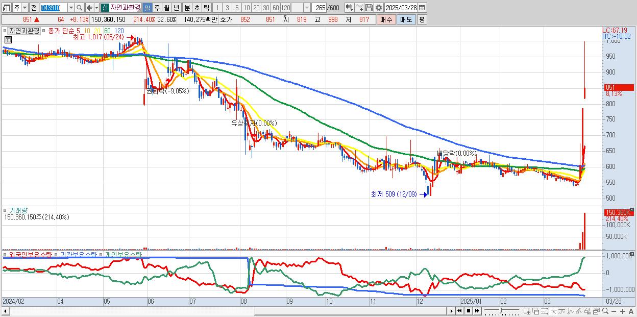 - 자연과환경 (851원 ▲ 8.13% , 시총: 965억, 거래량: 150,360,150, 거래대금:1,403억)