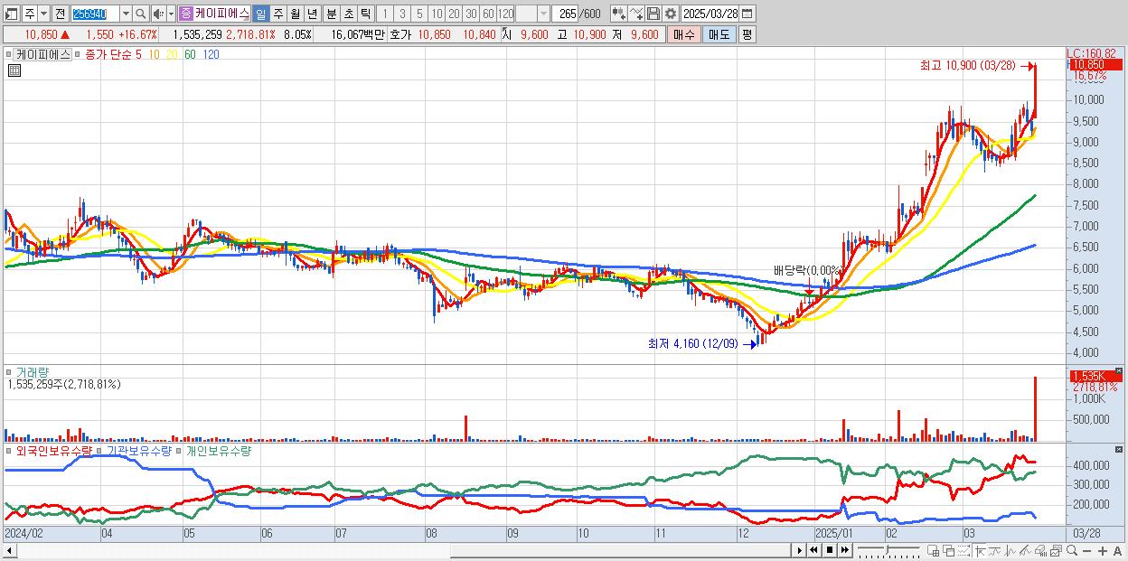- 케이피에스 (10,850원 ▲ 16.67% , 시총: 2,070억, 거래량: 1,535,259, 거래대금:161억)
