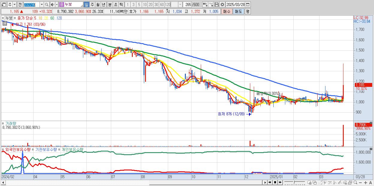 - 누보 (1,165원 ▲ 10.32% , 시총: 389억, 거래량: 8,790,382, 거래대금:111억)