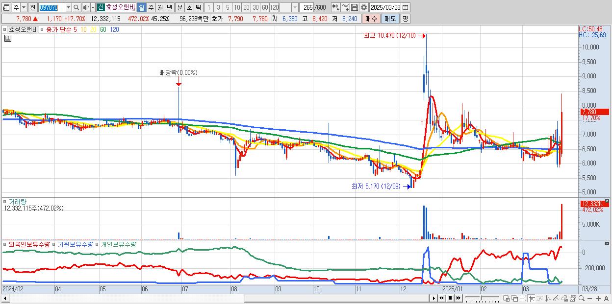 - 효성오앤비 (7,780원 ▲ 17.7% , 시총: 661억, 거래량: 12,332,115, 거래대금:962억)