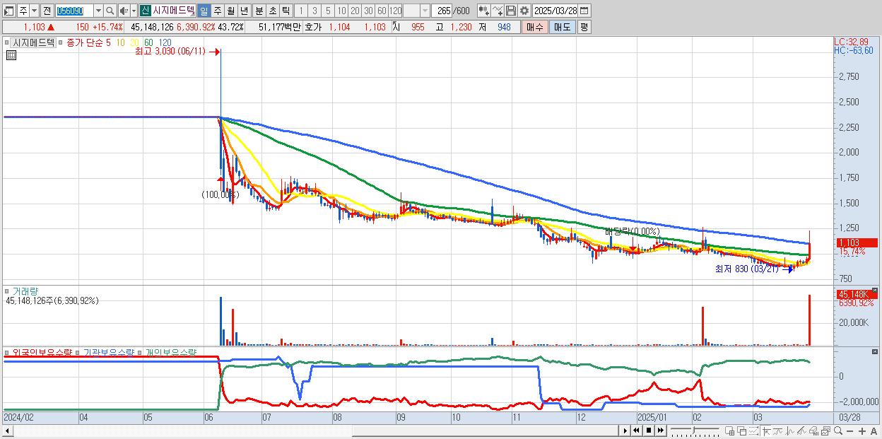 - 시지메드텍 (1,103원 ▲ 15.74% , 시총: 1,139억, 거래량: 45,148,126, 거래대금:512억)