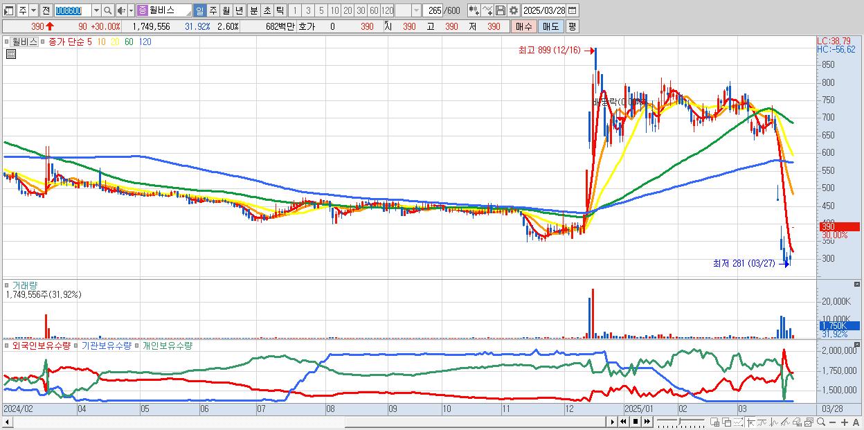 - 윌비스 (390원 ▲ 30% , 시총: 262억, 거래량: 1,749,556, 거래대금:7억)
