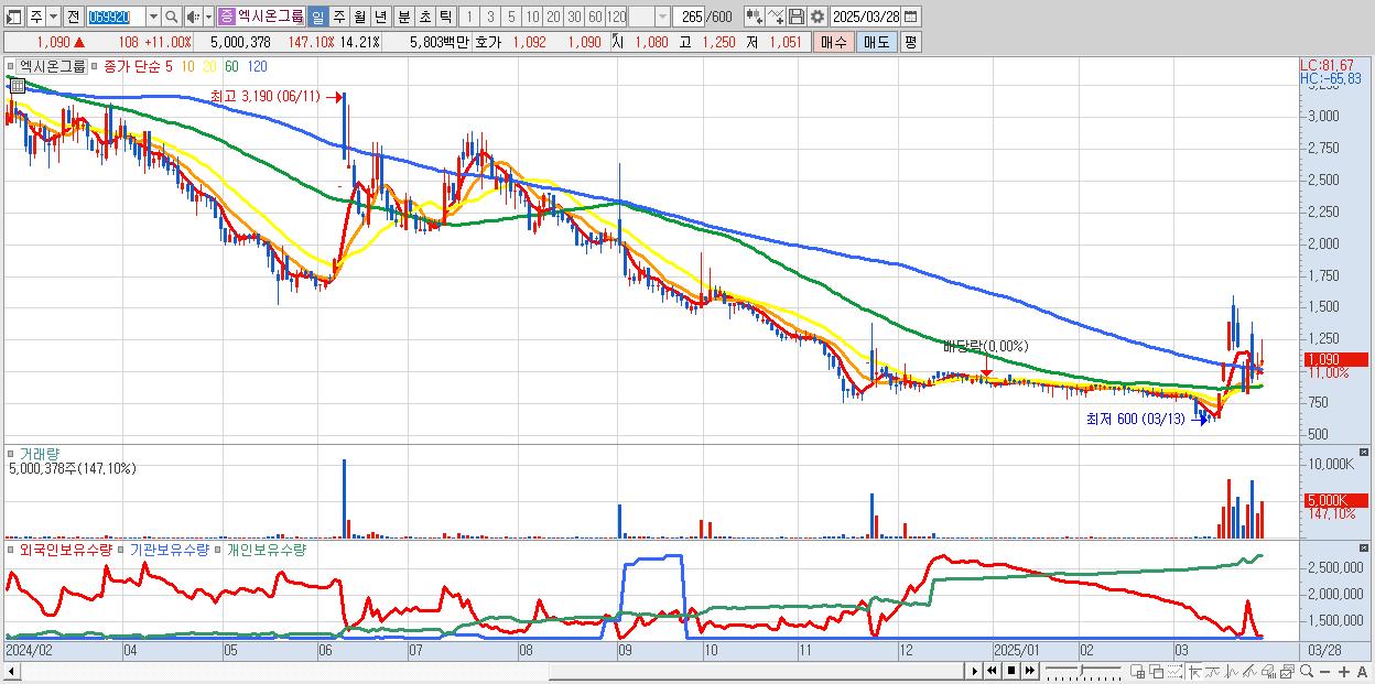 - 엑시온그룹 (1,090원 ▲ 11% , 시총: 384억, 거래량: 5,000,378, 거래대금:58억)