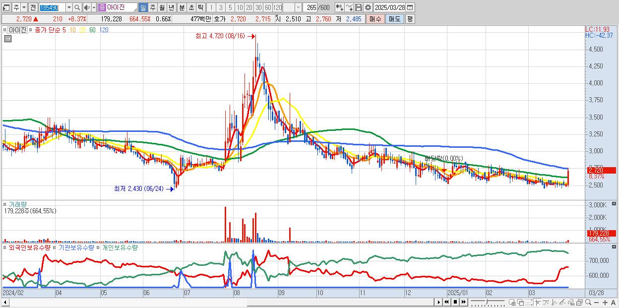 - 아이진 (2,720원 ▲ 8.37% , 시총: 735억, 거래량: 179,228, 거래대금:5억)