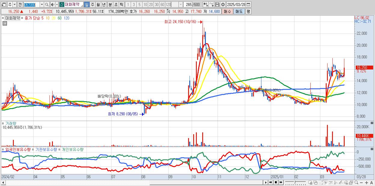 - 대화제약 (16,250원 ▲ 9.72% , 시총: 3,025억, 거래량: 10,445,959, 거래대금:1,743억)