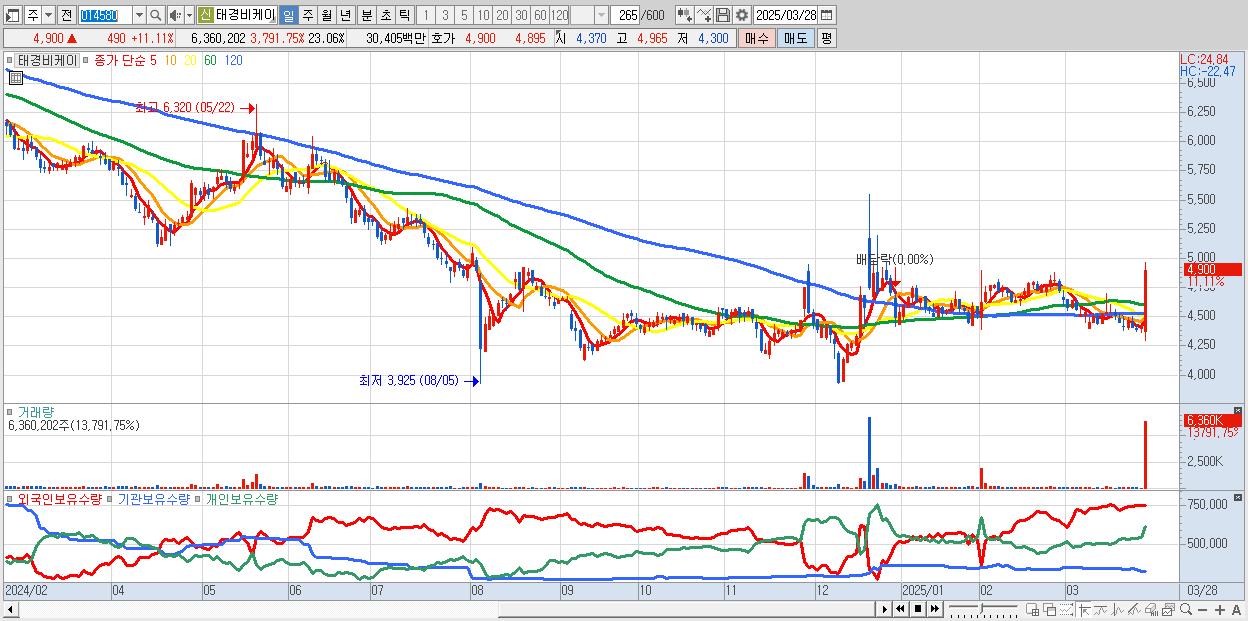 - 태경비케이 (4,900원 ▲ 11.11% , 시총: 1,352억, 거래량: 6,360,202, 거래대금:304억)