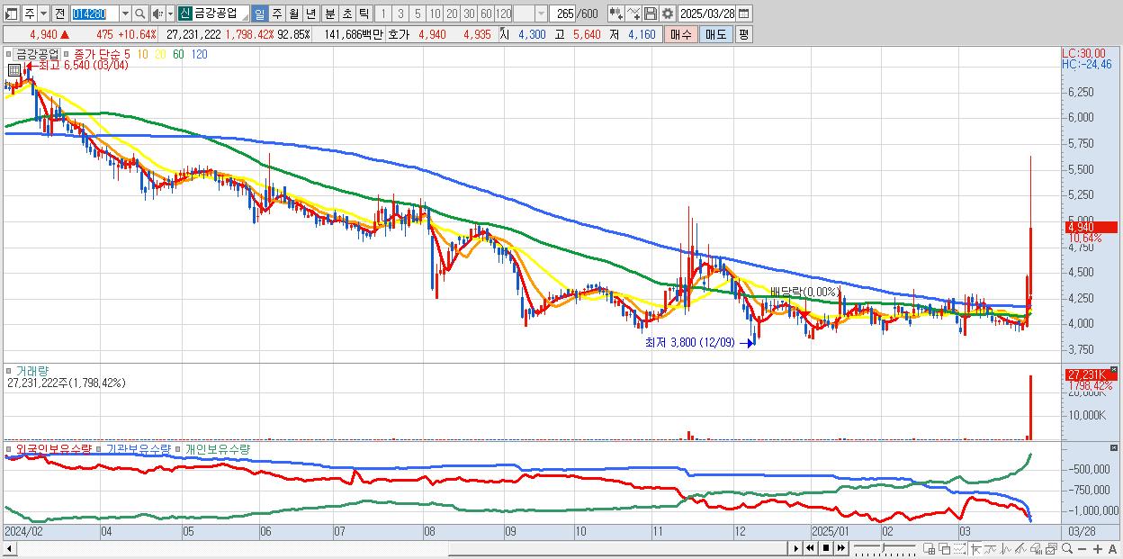 - 금강공업 (4,940원 ▲ 10.64% , 시총: 1,449억, 거래량: 27,231,222, 거래대금:1,417억)