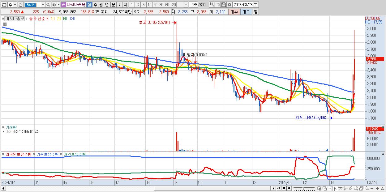 - 아시아종묘 (2,560원 ▲ 9.64% , 시총: 309억, 거래량: 9,083,862, 거래대금:245억)
