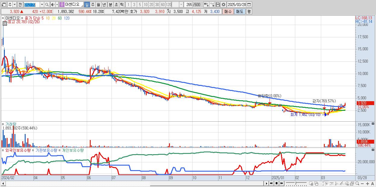 - 아센디오 (3,920원 ▲ 12% , 시총: 406억, 거래량: 1,893,382, 거래대금:74억)