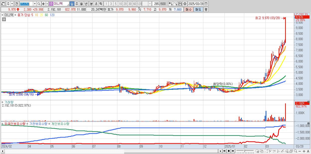 2.이니텍 9,970원 ▲ 29.99% (KOSDAQ, 053350)