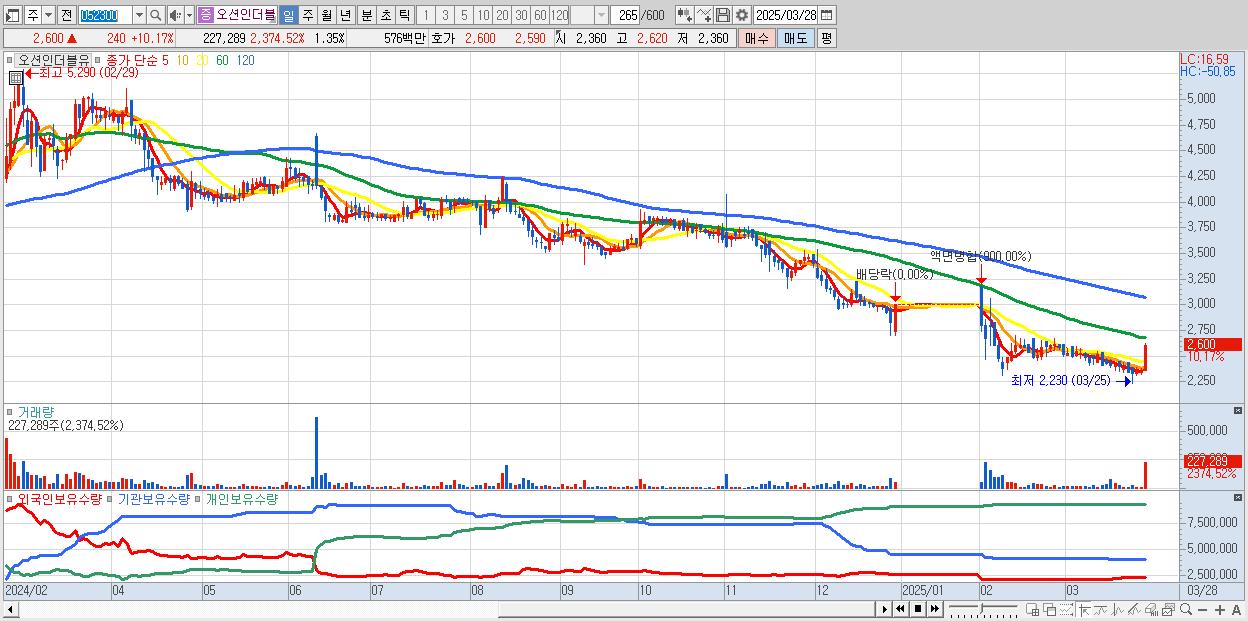 - 오션인더블유 (2,600원 ▲ 10.17% , 시총: 438억, 거래량: 227,289, 거래대금:6억)