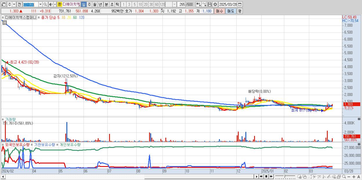 - 디에이치엑스컴퍼니 (1,303원 ▲ 9.31% , 시총: 224억, 거래량: 731,761, 거래대금:10억)