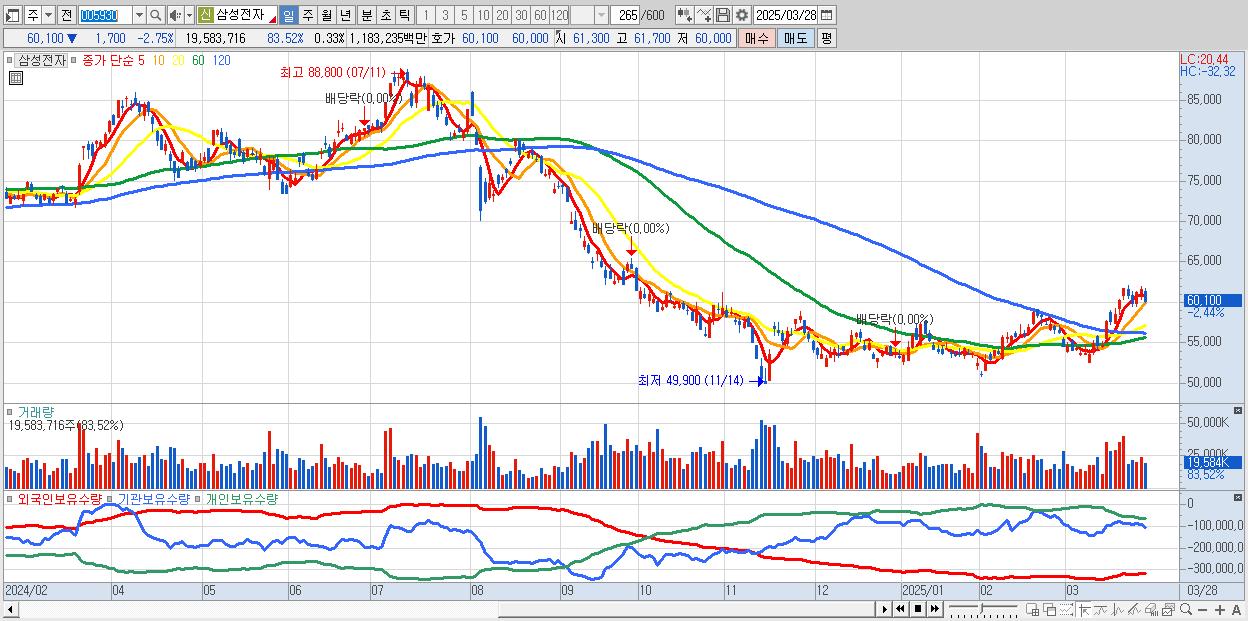 - 삼성전자 (60,200원 ▼ -2.59% , 시총: 3,563,622억, 거래량: 16,282,514, 거래대금:9,837억)