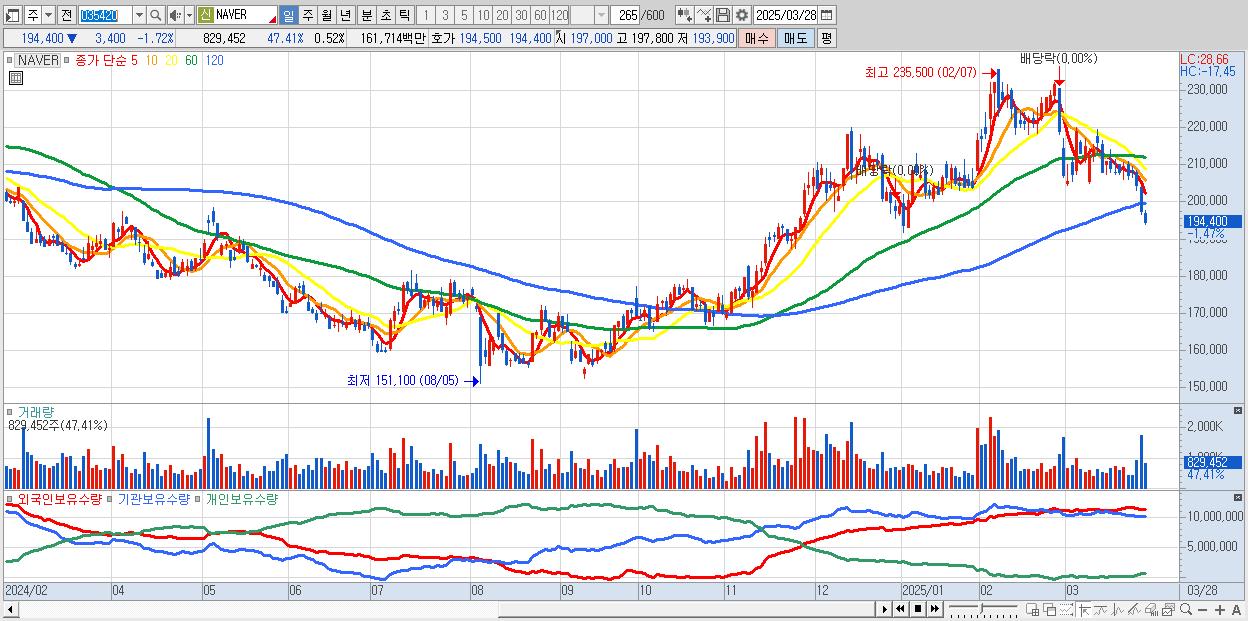- NAVER (194,700원 ▼ -1.57% , 시총: 308,477억, 거래량: 700,564, 거래대금:1,366억)