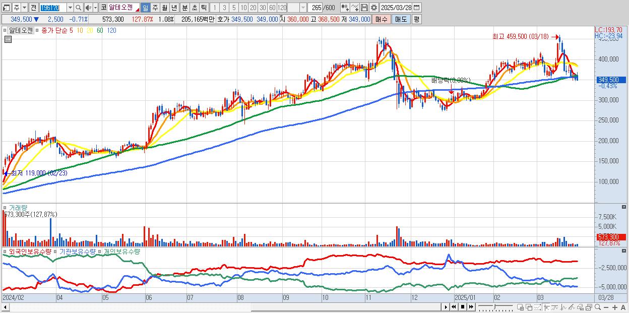 - 알테오젠 (352,500원 ▲ 0.14% , 시총: 187,949억, 거래량: 376,195, 거래대금:1,346억)