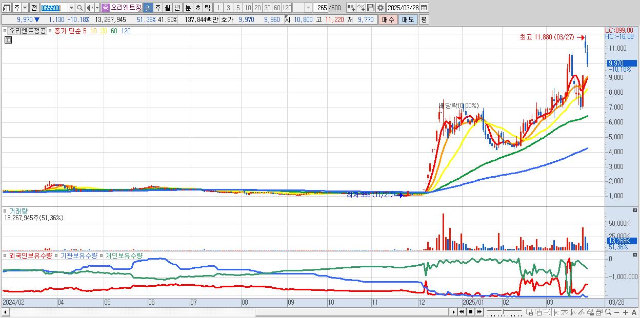 - 오리엔트정공 (9,970원 ▼ -10.18% , 시총: 3,165억, 거래량: 13,267,945, 거래대금:1,378억)