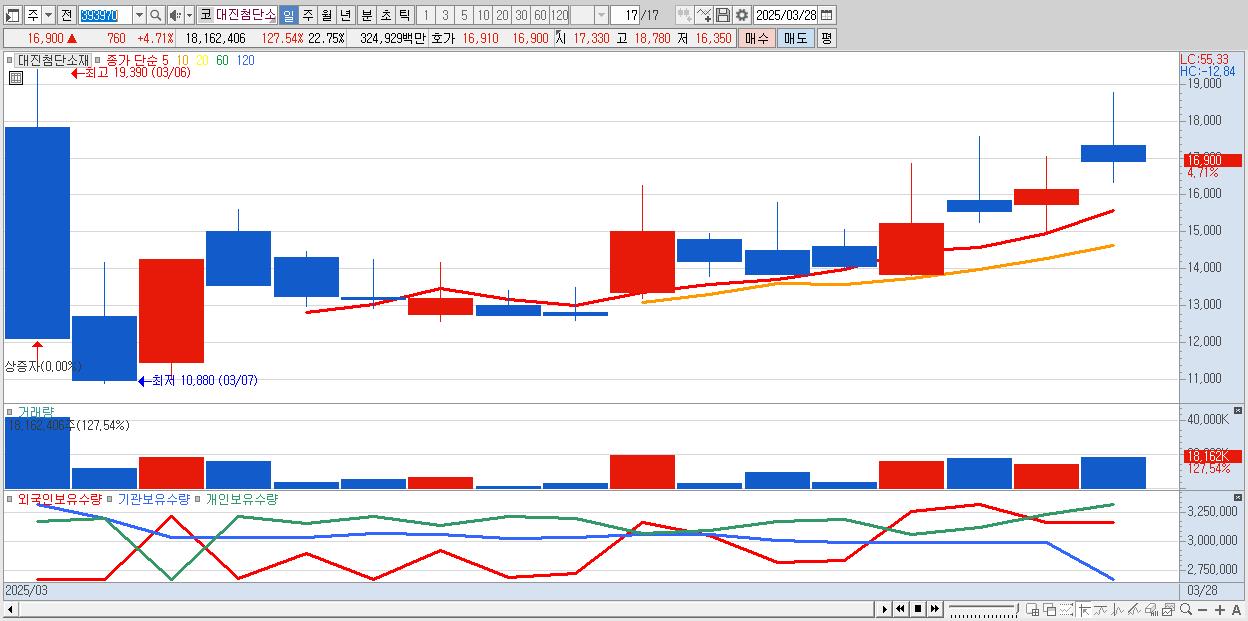 - 대진첨단소재 (16,900원 ▲ 4.71% , 시총: 2,501억, 거래량: 18,162,406, 거래대금:3,249억)