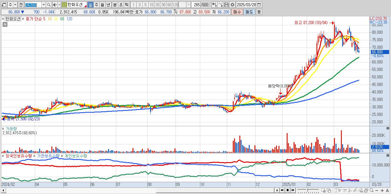 - 한화오션 (67,000원 ▼ -0.74% , 시총: 205,297억, 거래량: 1,790,358, 거래대금:1,210억)