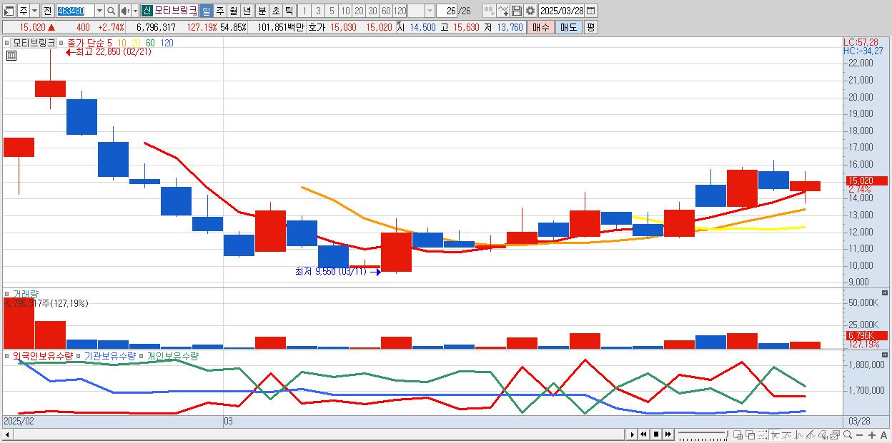 - 모티브링크 (15,020원 ▲ 2.74% , 시총: 1,861억, 거래량: 6,796,317, 거래대금:1,019억)