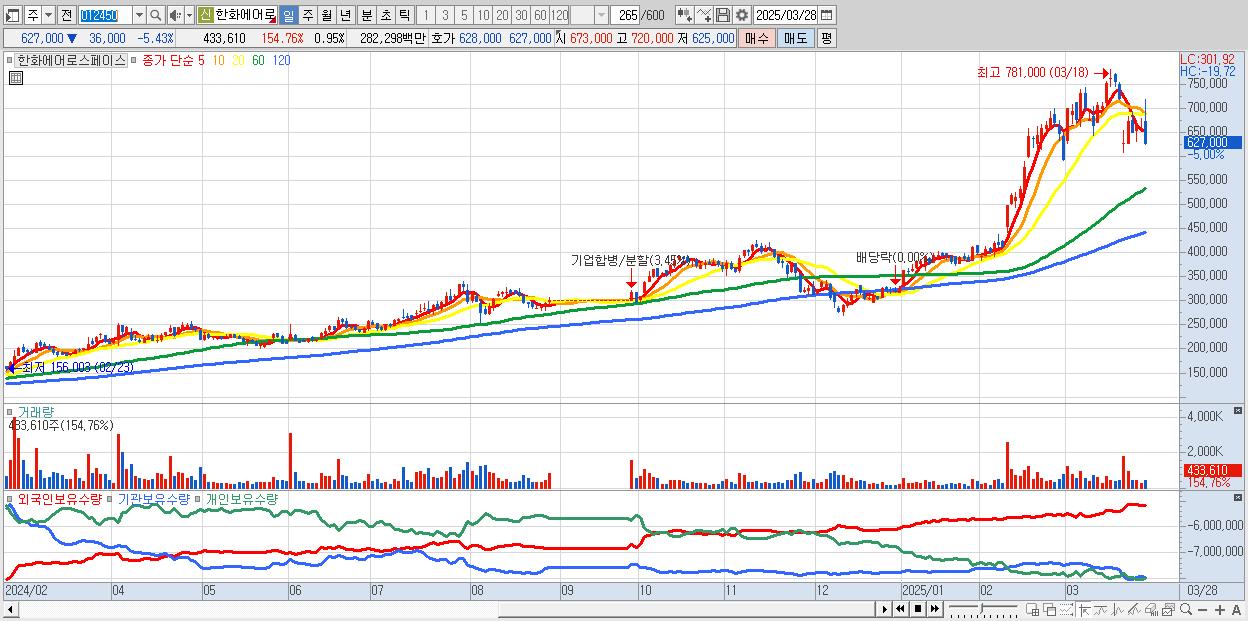 - 한화에어로스페이스 (630,000원 ▼ -4.98% , 시총: 287,161억, 거래량: 304,634, 거래대금:1,981억)