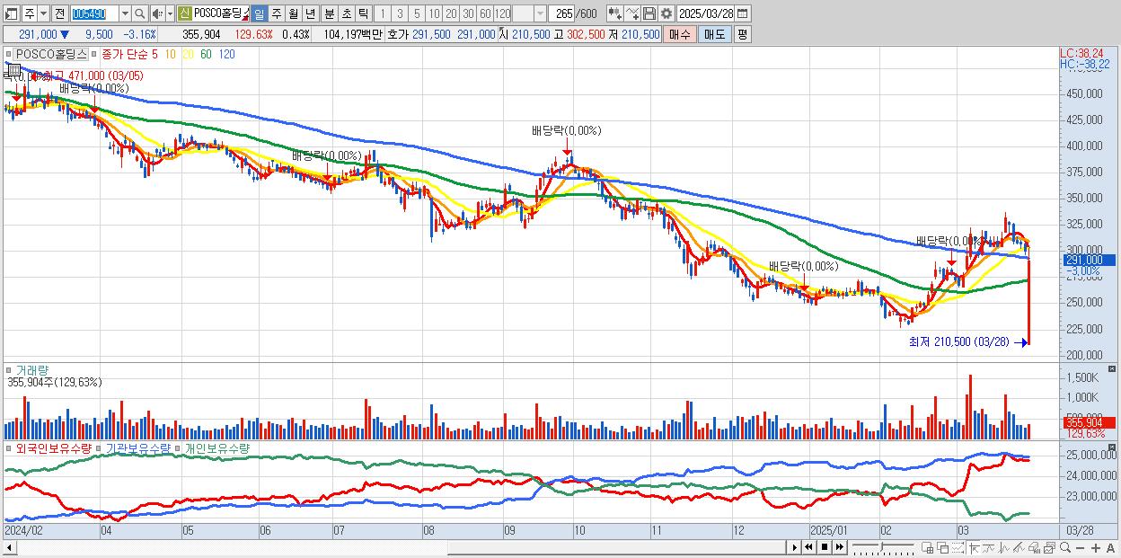 - POSCO홀딩스 (292,000원 ▼ -2.83% , 시총: 241,263억, 거래량: 275,386, 거래대금:806억)